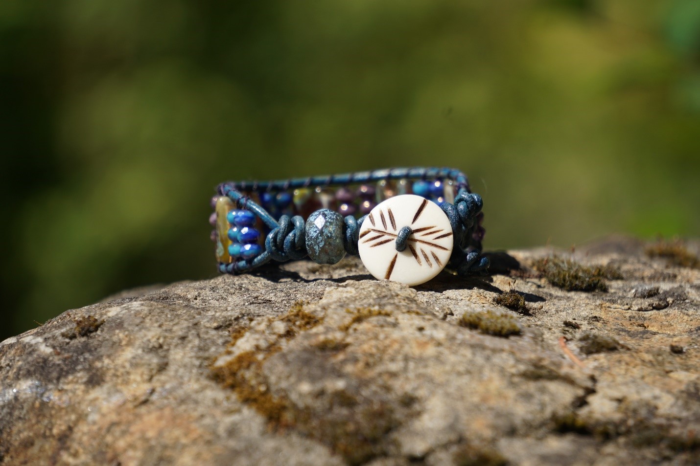 beige button, blue leather, blue/purple glass Czech beads and multi-color tub beads of reds, yellow, and beige colors