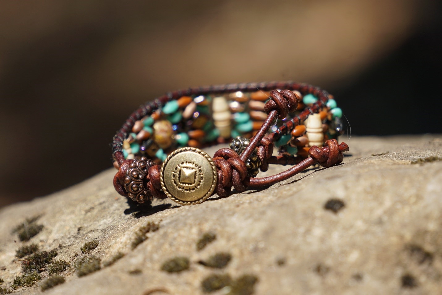 vintage gold button, dark cherry leather, bronze metal beads, bronze, turquois, and beige/pink Czech beads