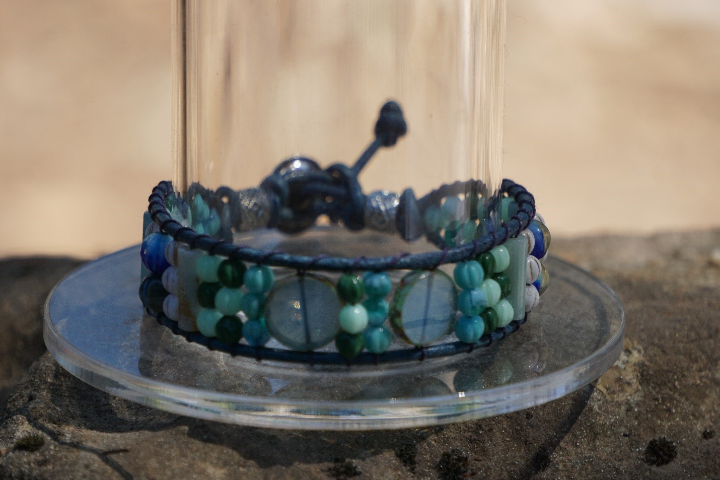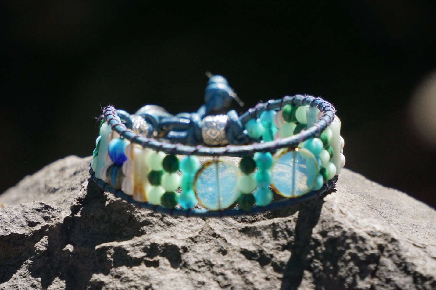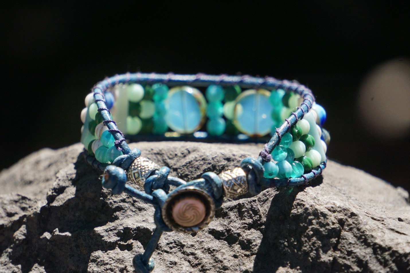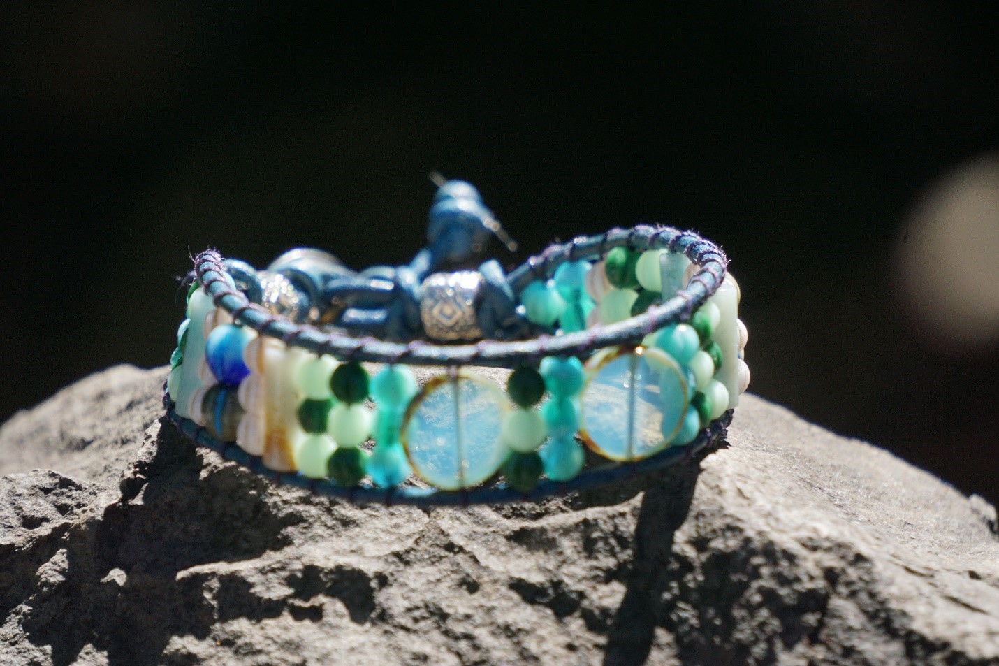 vintage pearl silver button, greens and blues Czech beads, blue leather